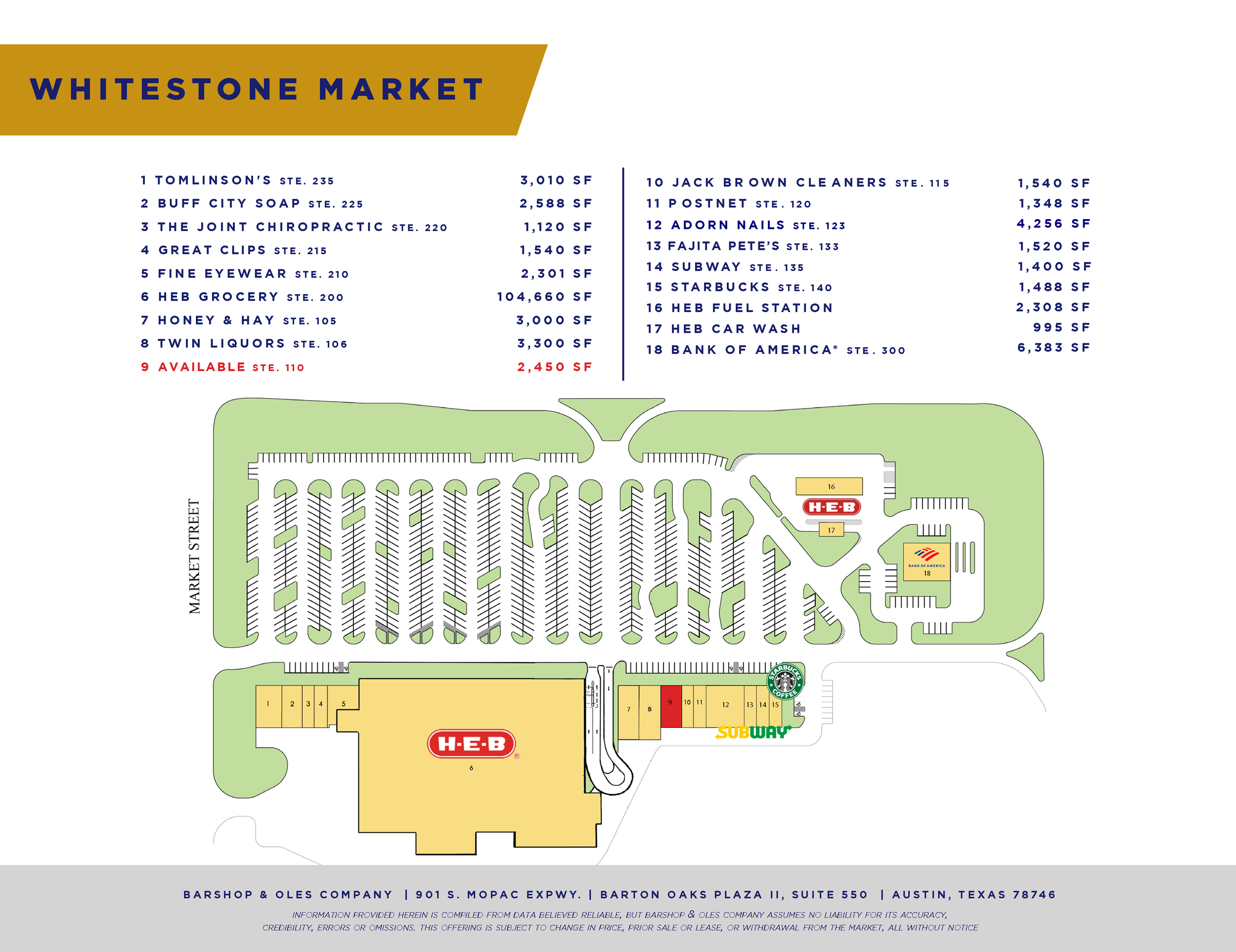 The center is anchored by a 104,660 square foot H-E-B that was expanded and renovated in 2012, as well as a free-standing Home Depot, and includes a quality mix of national, regional, and local retail, restaurant, and service tenants.